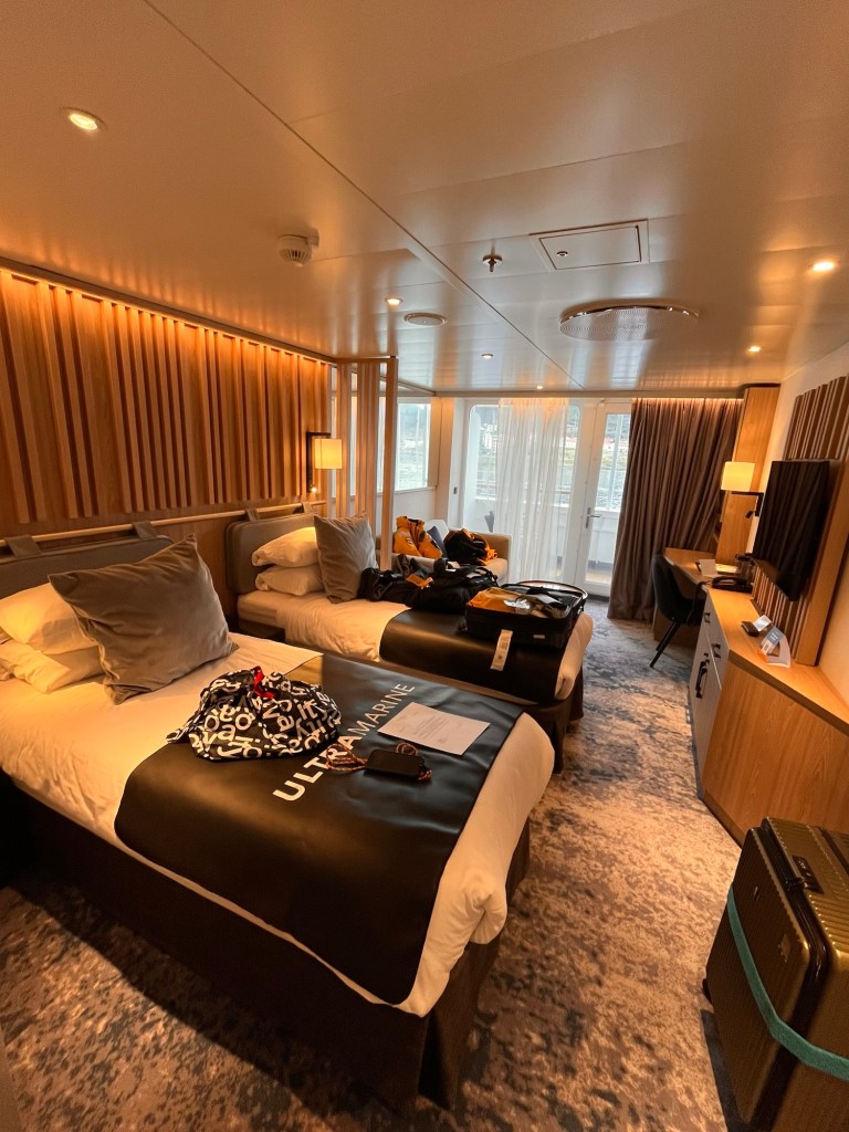 It will carry 199 passenger, 140 crew, 20 zodiacs, 2 helicopters and sundry kayaks and paddleboards. There’s a lecture hall, dining room, lounge, library, cafe, gym, sauna and spa – a little fancier than my previous Russian ride.